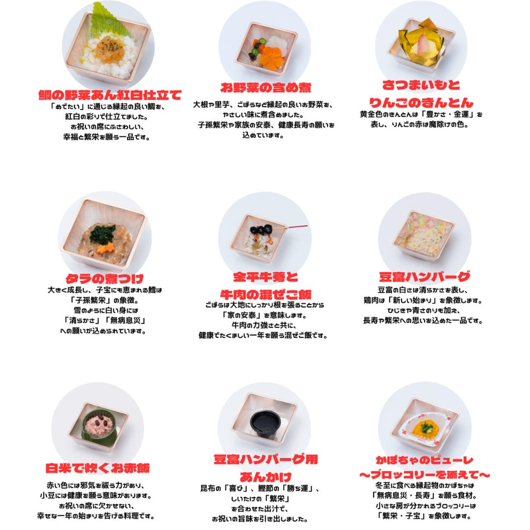 普段、離乳食を食べられるお子さまにもお正月ならではの祝い肴や、新年の幸多きことを願ったお料理を数多く盛り込んでおります。